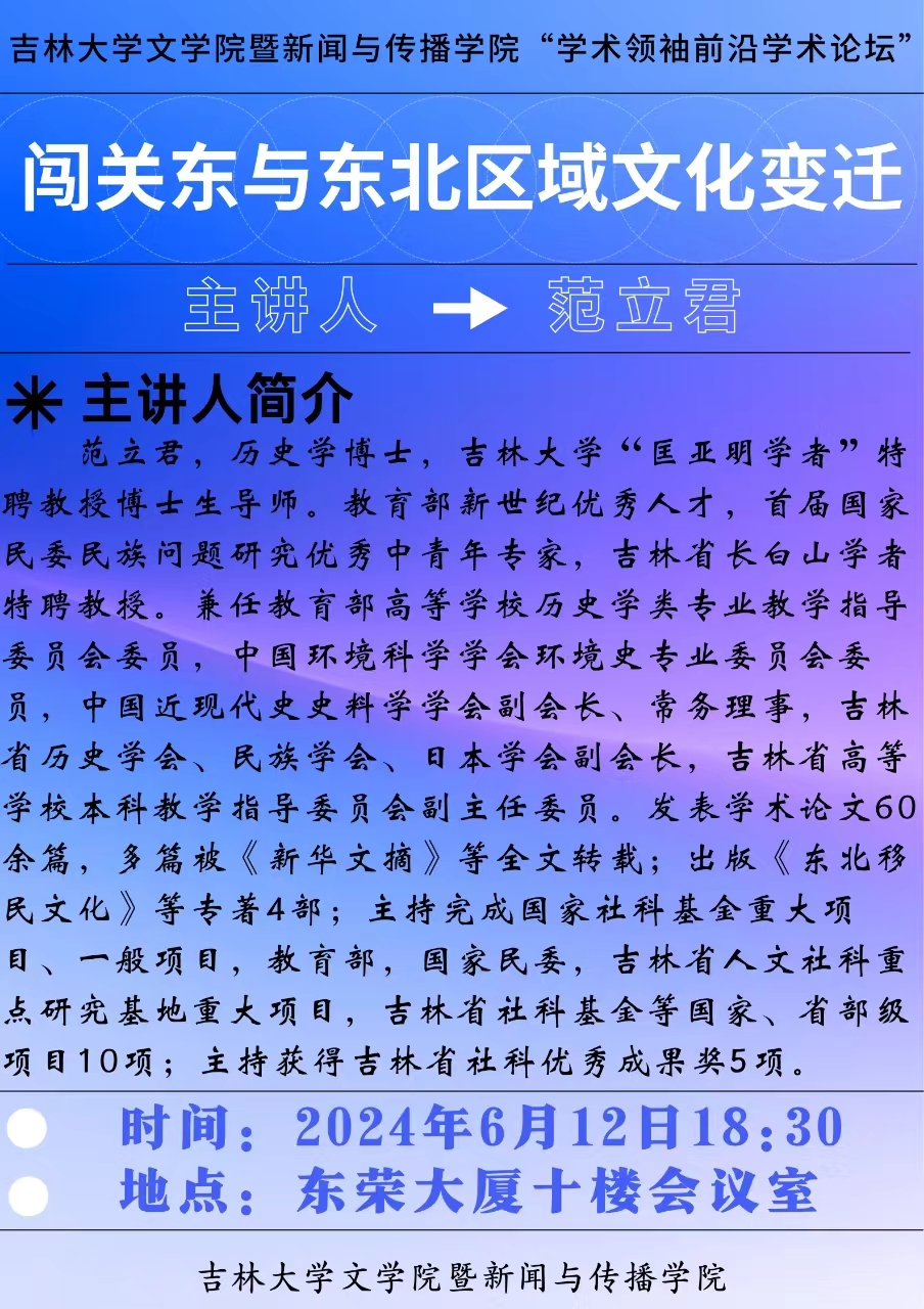 主讲人简介:范立君,历史学博士,吉林大学“匡亚明学者”特聘教授博士生导师。教育部新世纪优秀人才,首届国家民委民族问题研究优秀中青年专家,吉林省长白山学者特聘教授。兼任教育部高等学校历史学类专业教学指导委员会委员,中国环境科学学会环境史专业委员会委员,中国近现代史史料学学会副会长、常务理事,吉林省历史学会、民族学会、日本学会副会长,吉林省高等学校本科教学指导委员会副主任委员。发表学术论文60余篇,多篇被《新华文摘》等全文转载;出版《东北移民文化》等专著4部;主持完成国家社科基金重大项目、一般项目,教育部,国家民委,吉林省人文社科重点研究基地重大项目,吉林省社科基金等国家、省部级项目10项;主持获得吉林省社科优秀成果奖5项。
