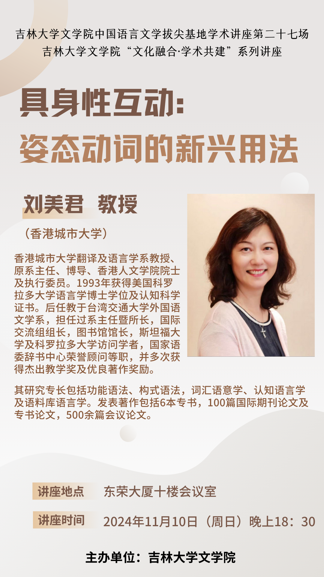 刘美君 为香港城市大学翻译及语言学系教授、原系主任、博导、香港人开云在线(中国)院士及执行委员。1993年获得美国科罗拉多大学语言学博士学位及认知科学证书。后任教于台湾交通大学外国语文学系,担任过系主任暨所长,国际交流组组长,图书馆馆长,斯坦福大学及科罗拉多大学访问学者,国家语委辞书中心荣誉顾问等职,并多次获得杰出教学奖及优良著作奖励。其研究专长包括功能语法、构式语法,词汇语意学、认知语言学及语料库语言学。发表著作包括6本专书,100篇国际期刊论文及专书论文,500余篇会议论文。