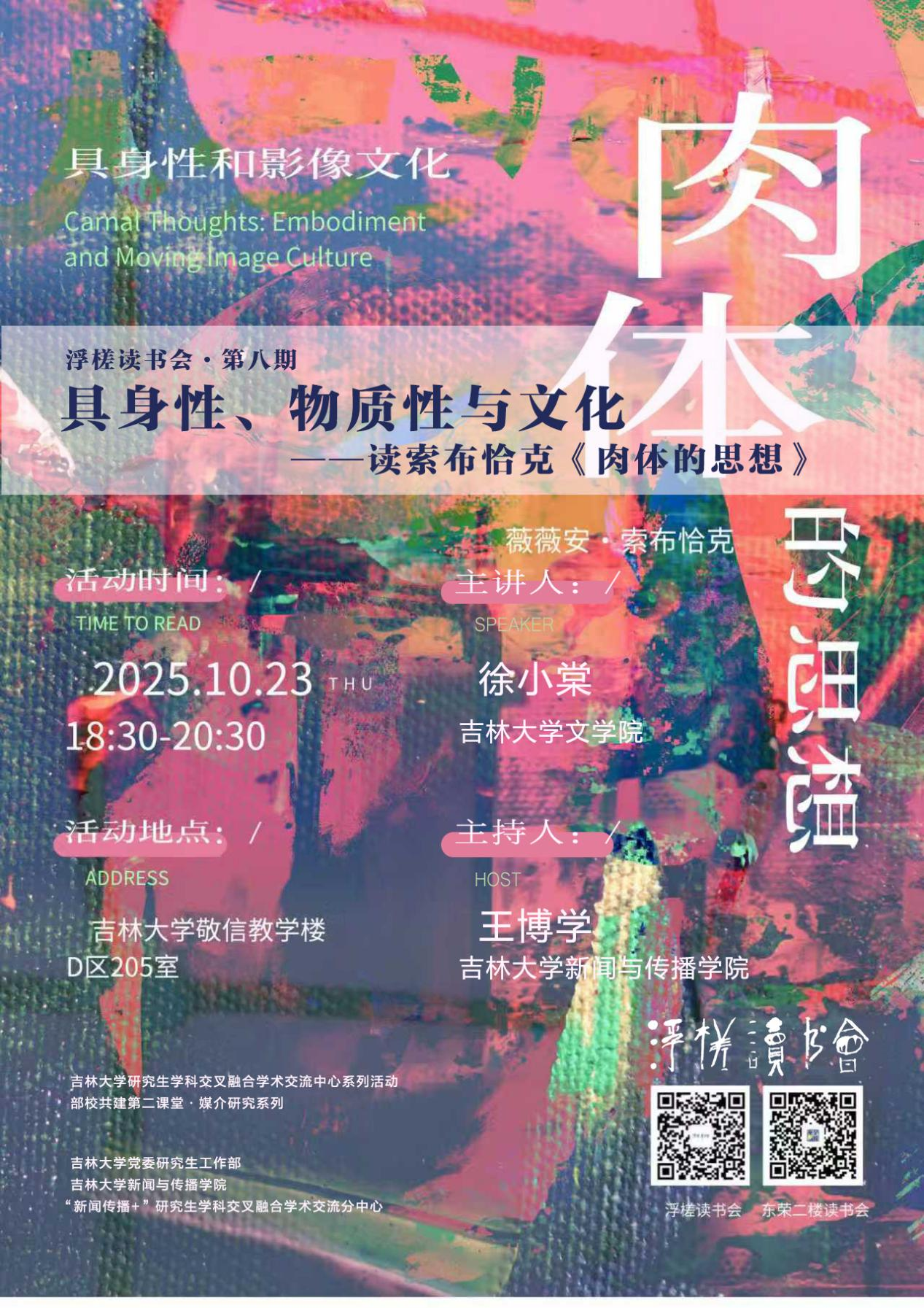 为活跃学术氛围,提升学科专业素养,拓宽学科交叉融合研究视野,强化学生运用理论视角观察、分析、阐释传播现象与文化现象的能力,特邀请开云在线文艺学教研室青年教师徐小棠博士做“具身性、物质性与文化——读索布恰克《肉体的思想》”专场主题研讨活动。具体通知内容如下: