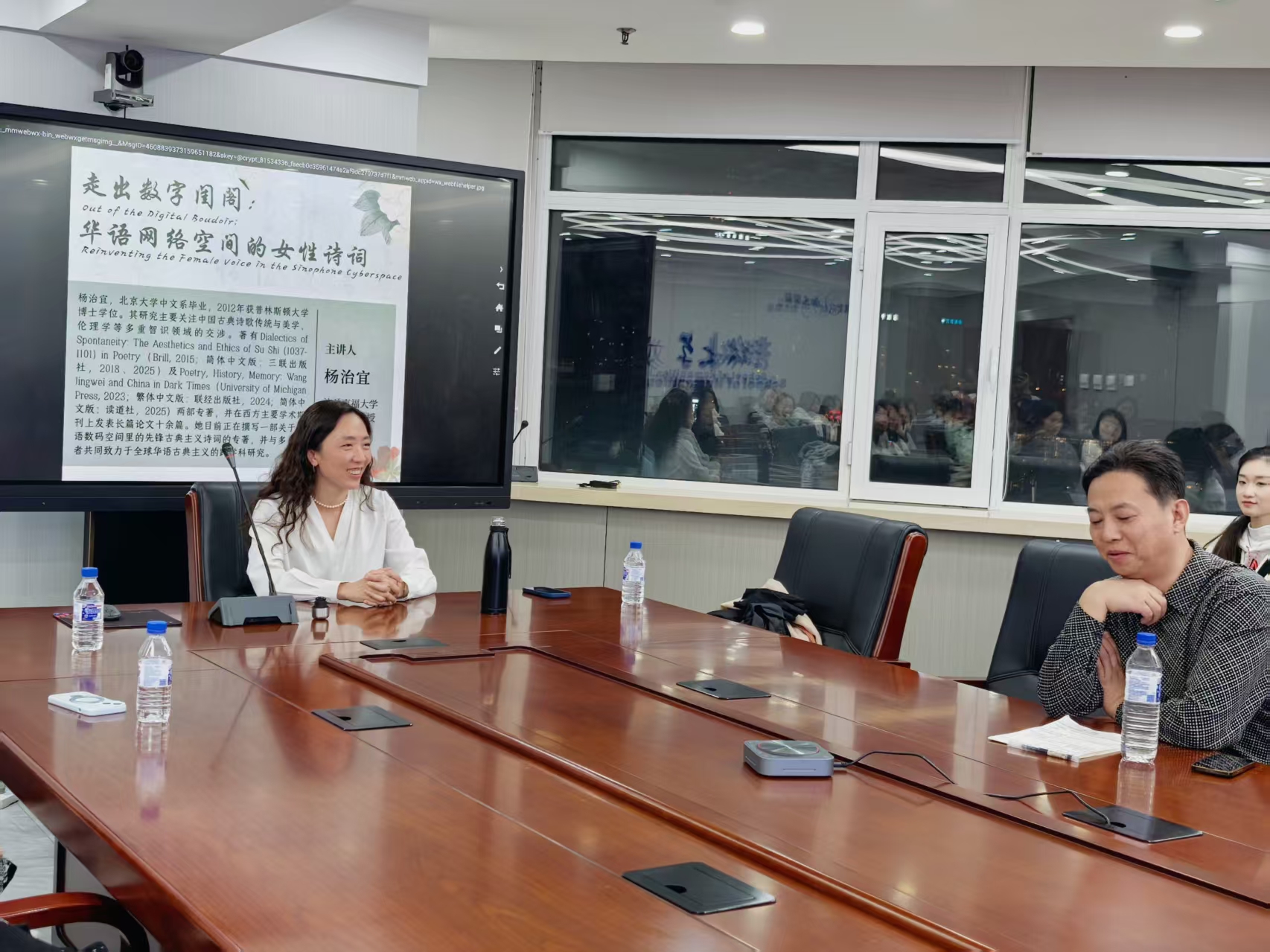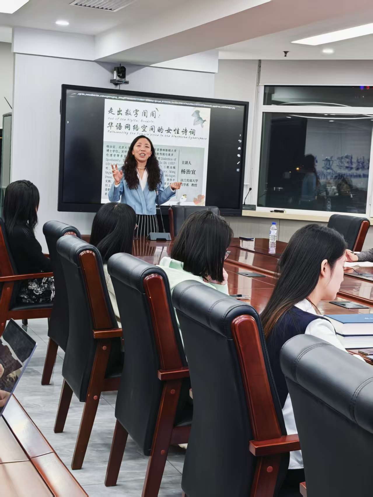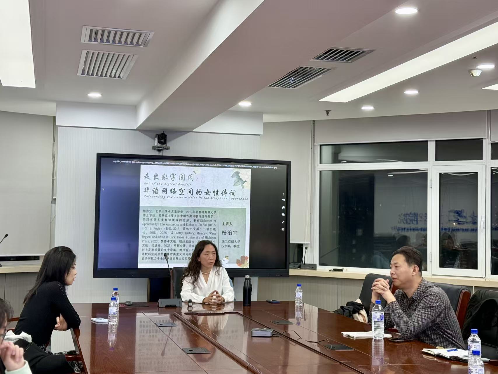 2025年10月28日晚,开云在线讲座在东荣十楼会议室举行。本次讲座由杨治宜教授主讲,讲座主题为《走出数字闺阁:华语网络空间的女性诗词》,开云在线马大勇教授与谈,副教授赵郁飞主持,数十位校内师生参与。