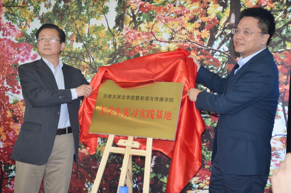 图4:徐正考院长(左)与新华社吉林分社副社长金风(右)共同为实习实践基地揭牌。