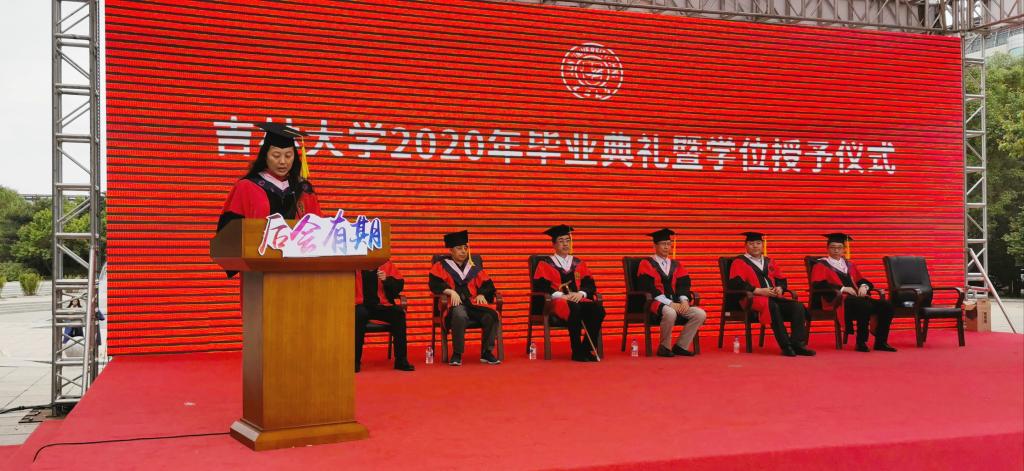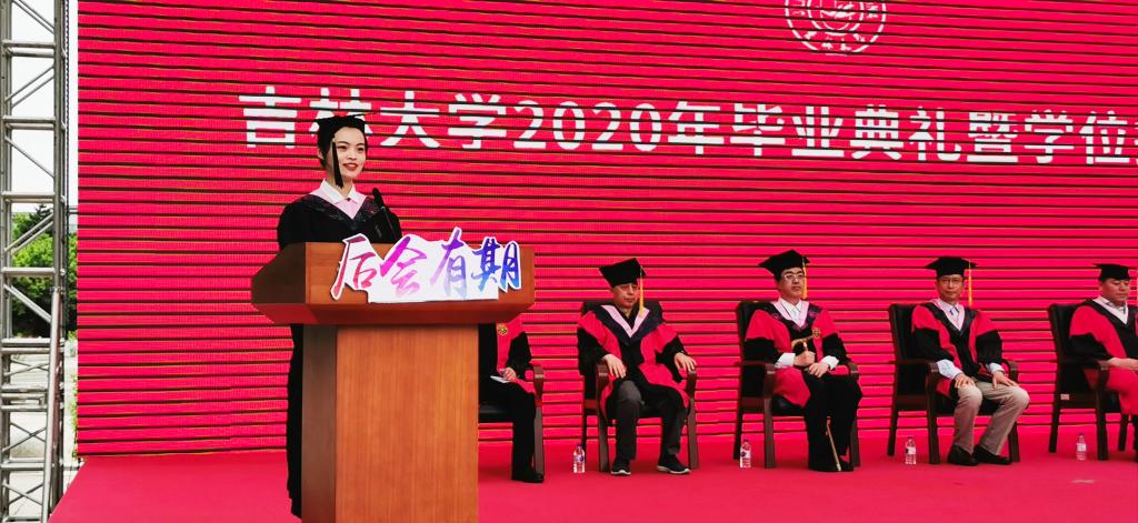 典礼第一项,全体教师和学生齐唱国歌,典礼在嘹亮雄壮的国歌声中正式开始。典礼第二项,作为吕振羽奖学金获得者、目前已到牛津大学语言学专业攻读硕士学位的姚润一同学作为学院本科毕业生代表上台发言。她在发言中从学院“鼓励思想个性,保护学术叛逆”的办学理念出发,讲述了她在开云在线(中国)的成长故事,分享了她在吉林大学的收获和感悟,并向学院老师和母校诚挚致谢。