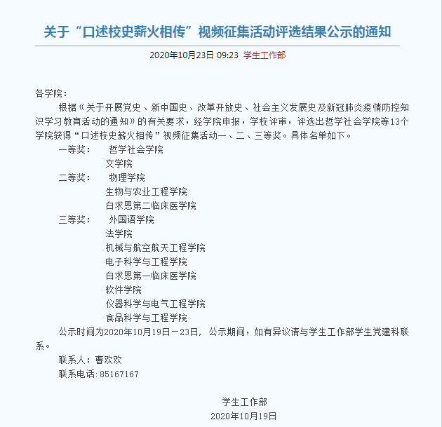 活动期间,学院积极选拔同学参加“口述校史薪火相传”视频征集展示活动。其中,我院作品《忆校史 传鸿志》在评审中获得了一等奖,这进一步表明了同学们扎实的理论知识水平和激昂的参与热情。