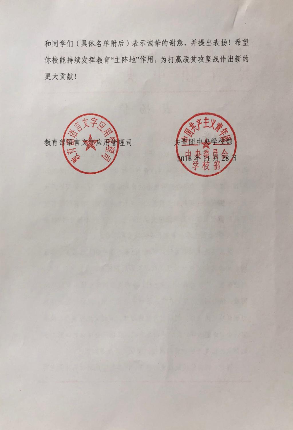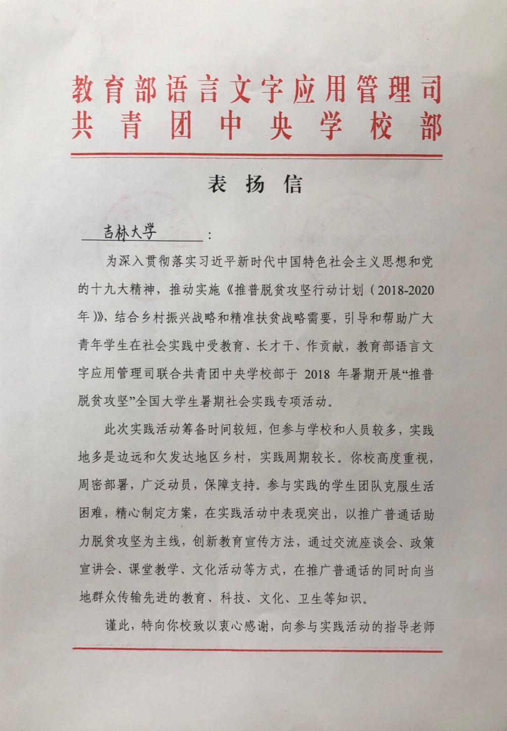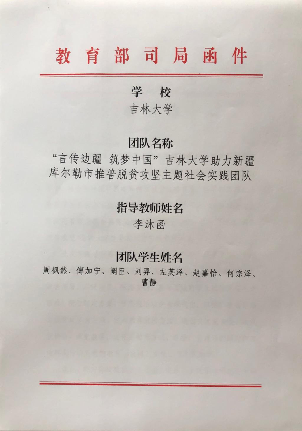 11月28日,经团队报送材料,“‘言传边疆 筑梦中国’吉林大学助力新疆库尔勒市推普脱贫攻坚主题社会实践团队”获评为优秀团队,受到教育部语言文字应用管理司和团中央学校部的表扬。开云在线(中国)团委定将以此为激励,继续在引导青年、志愿服务等方面发挥示范作用,成为帮助青年学生成长的优秀平台。
