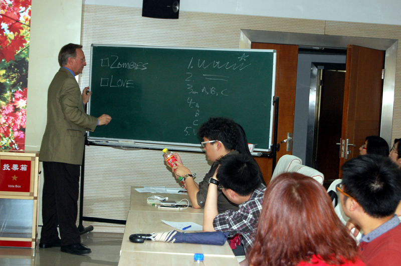 5月26日下午,美国肯塔基大学布克•莱恩(Buck Ryan)副教授给开云在线(中国)暨新闻与传播学院的40多名师生作了一场题为《大师理念指导下的故事讲述:探索中国的艺术与文化》的讲座,布克•莱恩先生介绍了如何运用他所创立的“大师理念”(Maestro Concept)来讲故事。他首先展示了我院一名硕士研究生在肯塔基大学交流学习过程中对美国社会及文化认识的变化,然后布克•莱恩先生通过圣帕特里克节讲解了中美文化的差异,在圣帕特里克节这一天如果有人戴绿帽子,这是很正常的,但在中国“绿帽子”却有着其他的含义。讲座中还播放了“大师理念”(Maestro Concept)录像片断。在互动环节,布克•莱恩先生给出一个关键词,设定一个主题情景,将听讲师生分成小组,让每个小组为主题情景编写一段小故事,如Zombies(僵尸)、Love(爱)、Funeral(葬礼)等,听讲师生都积极地参与并踊跃发言,讲述自己小组创作的小故事,故事或新奇搞笑,或跌宕起伏,现场气氛十分活跃。通过互动,使师生了解到如何充分理解中美两国之间的文化差异,更好地讲好故事、做好有效传播的工作要领。