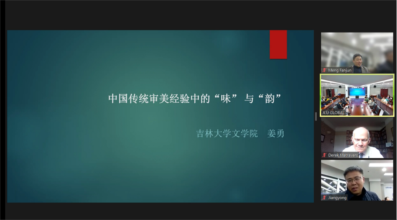 Derek教授认真记录并高度评价了姜勇教授阐述的中国美学经验中“味”与“韵”的独特审美特征。同时,他也提出了中国美学“淡”与“浓”的关系问题。在与Derek的交流环节中,姜勇教授补充说明“淡”是中国美学的主流和正宗,呈现了中国美学中“味”的独特魅力和深厚内涵,这与世界视野中的中国京剧审美之“浓”并不矛盾,且京剧审美的唱腔是否是一种绵延的“韵”和“淡”仍然值得进一步思考。他的发言增进了与会者对中国美学的理解,也为东西方美学交流提供了新的视角和思考空间。
