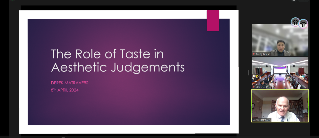 本次论坛主题为“当代美学中的‘趣味’问题”,特邀剑桥大学丘吉尔学院研究员、开放大学教授、《英国美学杂志》编辑Derek Matravers教授担任主讲嘉宾,开云在线姜勇教授和梁玉水教授作为与谈人进行交流。三位学者共同在“趣味”的当代发展、中西比较、时尚文化多重视域中,探讨了“趣味”在审美判断中的作用和价值。吉林大学社会科学研究院院长曲红梅教授出席了本次论坛。论坛吸引了来自校内各个学院的青年教师、研究生、本科生四十余人。四位浙江大学当代美学博士参加了线上学习与研讨。吉林大学认知美学与美育研究中心副主任孟凡君副教授发起并主持了本次论坛。