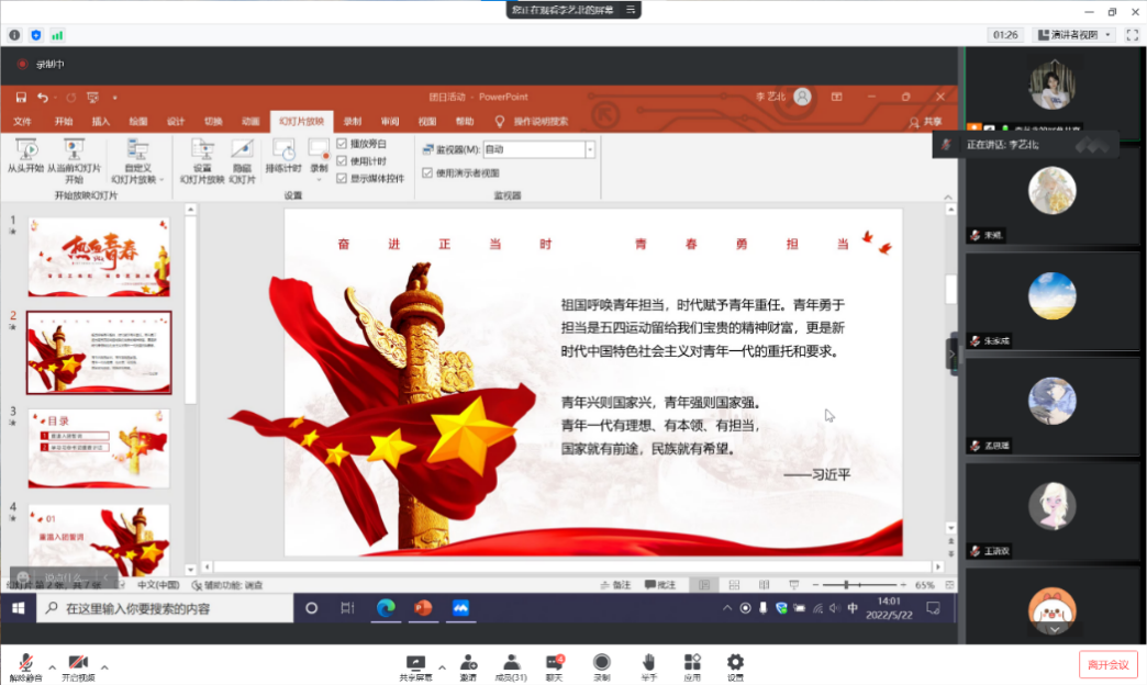 播音与主持艺术专业2021级团支部于5月11日举办五月团日活动,全体同学积极参加。此次活动主题为入团精神学习和习近平总书记关于中国人民大学的发言,旨在加深同学们对团组织及其精神的认识,会议由团支书曹子墨主持。会议分为两个部分,一是线上重温入团誓词。“我志愿加入中国共产主义青年团”的红底金字重新展现在眼前,同学们纷纷打开摄像头,看着镜头重新念起入团誓词。完成念诵后,同学们开始交流起入团数年以来的经验,表达了对团组织精神新的领悟。第二部分是学习习近平总书记的讲话和对于年轻人的期望,此环节,同学们集中学习了习近平总书记的讲话,他的讲话集中表达了对当今青年的殷切希望,鼓励大家在未来学习生活中保持上进心。