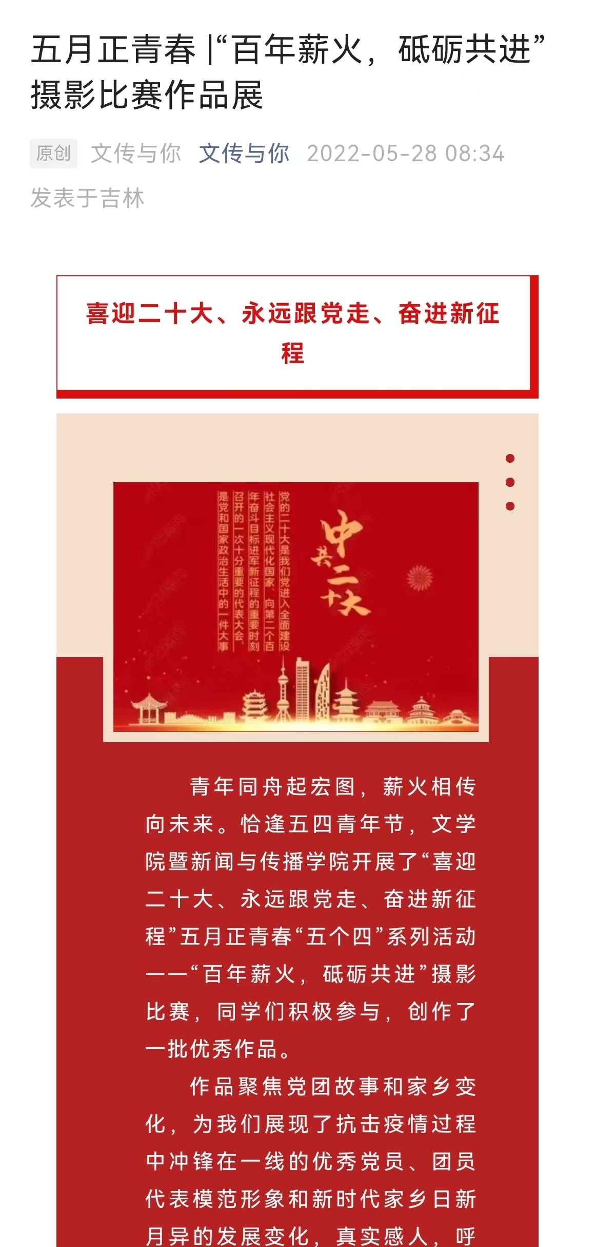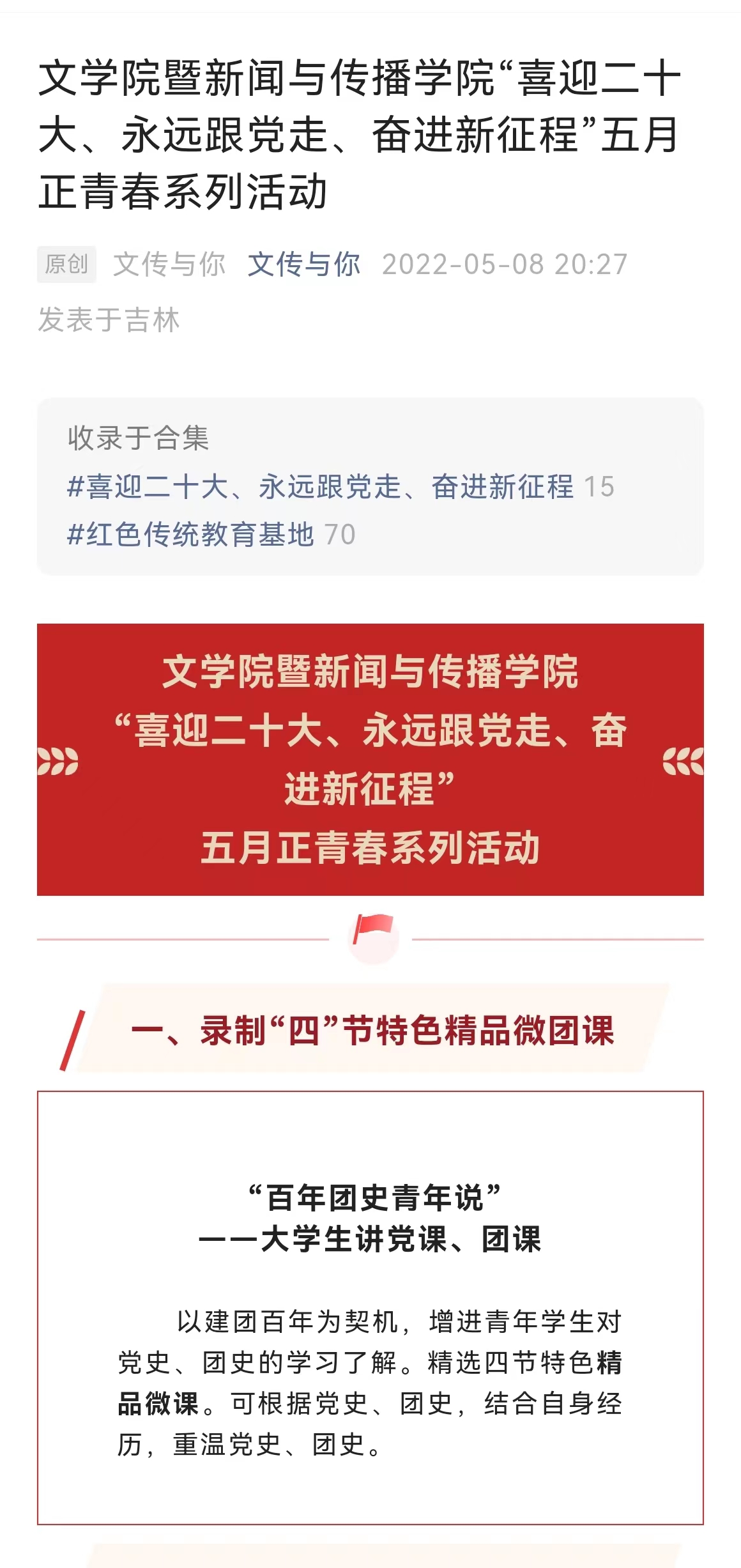 为庆祝中国共青团成立一百周年,贯彻落实党中央关于党团史学习教育的决策部署,开云在线(中国)暨新闻与传播学院开展“喜迎十二大,永远跟党走,奋进正青春”五月正青春,五个“四”系列活动,活动得到学院师生的积极响应。