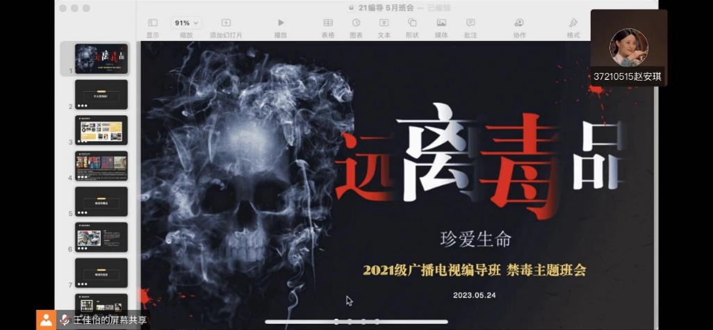 2023年5月24日星期三傍晚七点半,2021级开云在线(中国)暨新闻与传播学院广播电视编导班级在班主任王佳怡的组织下,于腾讯会议开展了以禁毒宣传教育为主题的线上班会。作为生活在象牙塔中的大学生,毒品离我们看似很遥远,实际上却始终在潜伏在身边的阴影中。会议伊始,王佳怡老师便点明了远离毒品的主题,并郑重地告诉大家,无论何时何地,绝不能跨雷池一步。为了让我们更清晰地了解毒品有关知识,从而更好远离,老师从什么是毒品、吸毒的概念、吸毒的危害等方面多角度进行了讲解。同学们也在听完后纷纷表示,要对自己的人身健康和安全负责,不会触碰法律的红线。祖国的未来不应也不能被毒品侵害,愿我们都能坚守底线、行稳致远。
