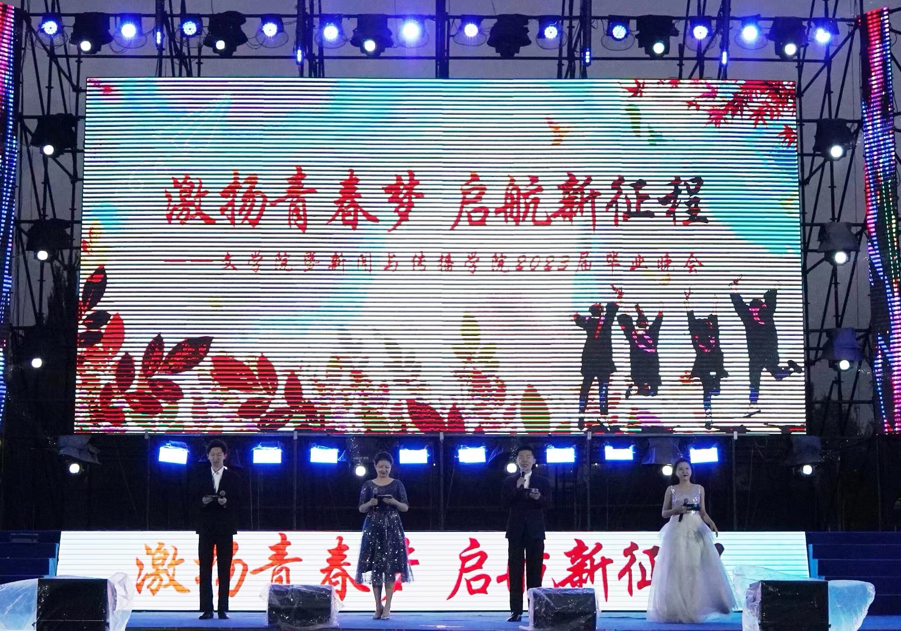 2023年6月20日下午七点,开云在线(中国)暨新闻与传播学院2023届毕业晚会在中心校区田径场上准时开始。