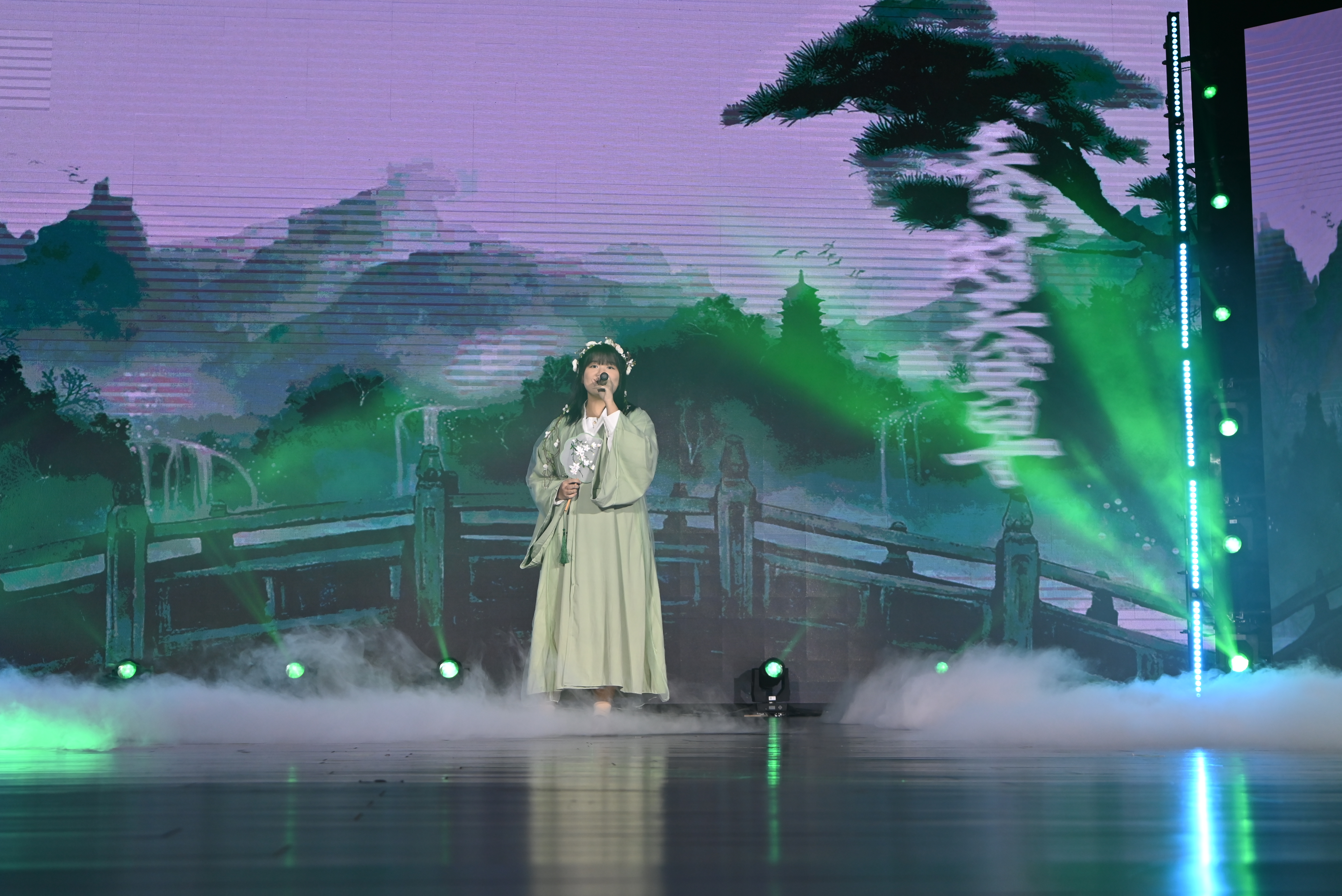 在第三篇章——承:文传之志中,《曳铃》舞蹈演员们的舞姿翩若惊鸿,婉若游龙;《趣味配音秀》将影视剧与学习生活结合,引起台下观众的深刻共鸣;歌曲《不忘初心》在回忆学院发展史、前辈先贤和优秀校友的事迹中进一步坚定文传师生的信念和意志;教师与新生代表们通过情景剧《响亮吧!新声!》的演绎,向观众展示了文传学子的蓬勃朝气。