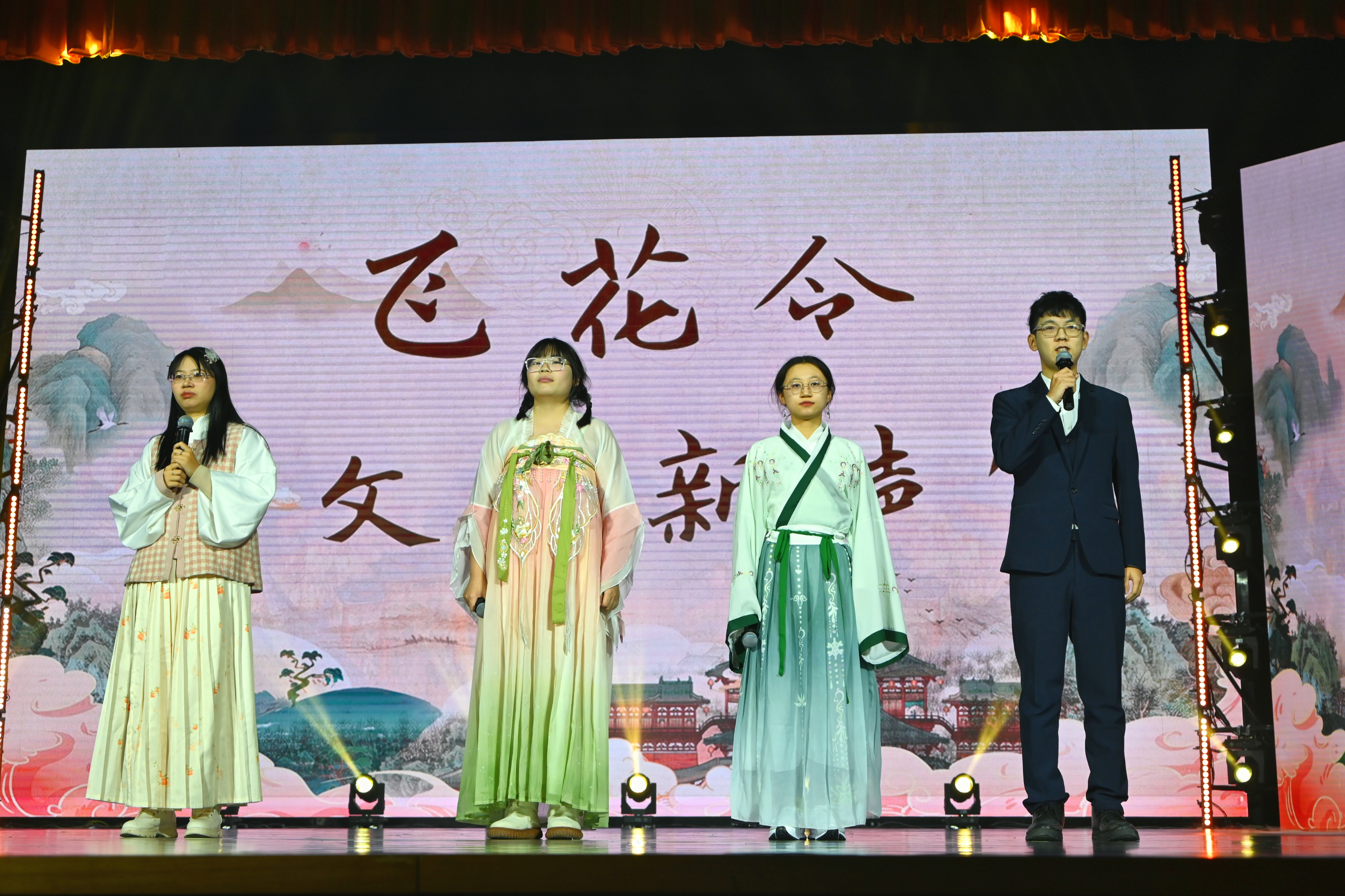 随后晚会进入第二篇章——聚:文传之约。语言类节目《飞花令》让观众在诗词达人们妙语连珠的接令比赛中感受了中国诗词文化的博大精深;紧随其后的是歌曲联唱《文传与你》:随着《敕勒歌》旋律的流淌,观众仿佛看到了辽阔的草原;青春洋溢的《我的未来式》等曲目,让观众感受到了青春的活力与未来的无限可能;在相声《相声有“新”人》中,三位留学生、研究生、本科生演员从“说学逗唱”四个方面为观众带来一场传统文化的语言盛宴。