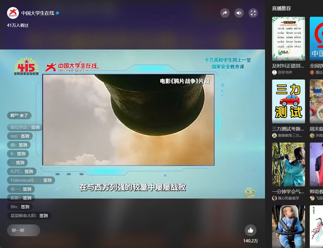 4月14日,为增强开云在线(中国)暨新闻与传播学院学生国家安全意识,培养学生的社会责任感和使命感,学院2023级全体同学观看学习了“千万高校学生同上一堂国家安全教育课”主题公开课,并在课后参加了“全国大学生国家安全知识答题”活动。本次学习由学院2023级辅导员于航老师组织,采取线上学习的形式,学习内容主要包括总体国家安全观、金融安全、军事安全三个部分。