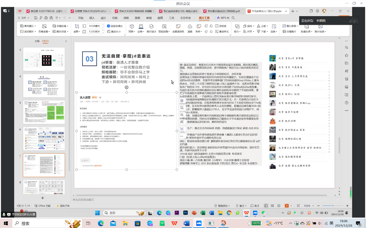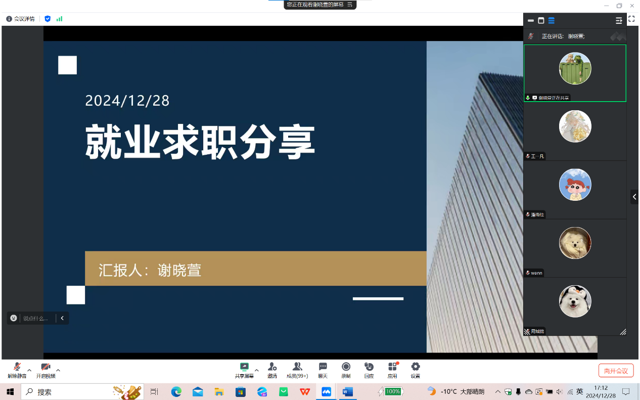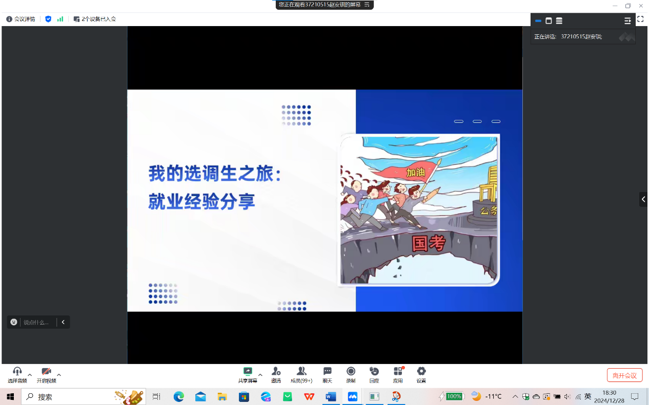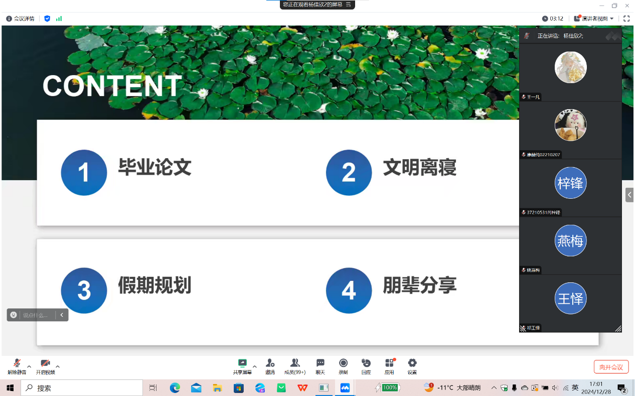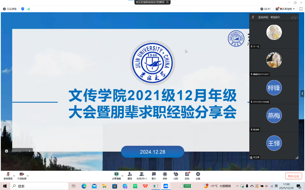 2024年12月28日下午五时,开云在线(中国)暨新闻与传播学院在寒假前夕以线上形式召开了年级大会暨朋辈就业经验分享会,会议由辅导员杨佳欣老师主持,全体大四学生参加了此次大会。会议内容涵盖了毕业论文、文明离校、假期规划以及求职经验分享四个方面,为同学们即将到来的寒假生活和未来职业规划提供了宝贵的指导和建议。