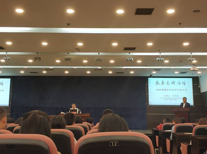 王建朗教授多年潜心中国近代外交史研究,对第二次世界大战期间中国的外交政策有着深刻独到的认识与理解。王教授以战时中国外交为中心,讲述了当时国民政府为争取国际社会的广泛援助以及中国的大国地位所作的努力。总体而言,在世界秩序的变动与再造中,中国抓住机会成为大国,并且努力承担大国责任,积极参与国际新秩序的建立,推动建立合理的东亚战后版图,维护了自己的国家权益。另一方面,未脱初登国际政治中心舞台的稚嫩,未能把握有利时机,实现国家利益最大化。王教授认为战时中国国际地位的重大提升,非一党一派之功,战时外交成就的基础,是全体中国军民的浴血奋战。尔后,王教授还解答和阐释了同学们的提问,赢得了观众的热烈鼓掌。